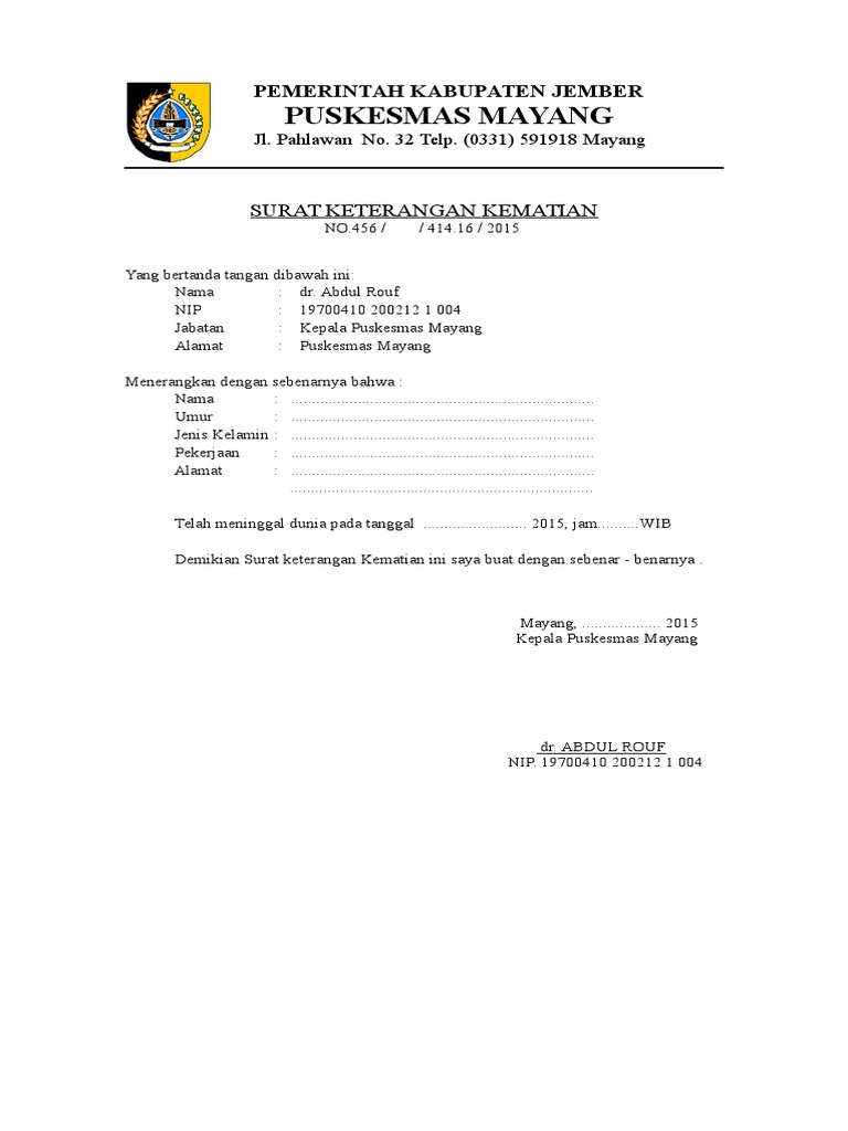 Contoh surat kematian from imgv2-2-f.scribdassets.com Berkas dokumen persyaratan ke kantor kelurahan guna mendapat surat keterangan kematian. 3.asli ktp pelapor dan formulir pelaporan kematian (contoh) · 4.asli ktp almarhum atau surat keterangan domisili jika tidak memiliki ktp (contoh) Cara membuat surat kematian pun cukup mudah. Yang dibuat rangkap 6 (enam) dapat menjadi acuan . Surat pengantar dari ketua rt; Surat pengantar dari kelurahan setempat. Surat keterangan meninggal dari dokter atau rumah sakit (jika meninggal di rs). Apabila almarhum meninggal di rumah sakit maka dapat meminta surat keterangan dokter.
